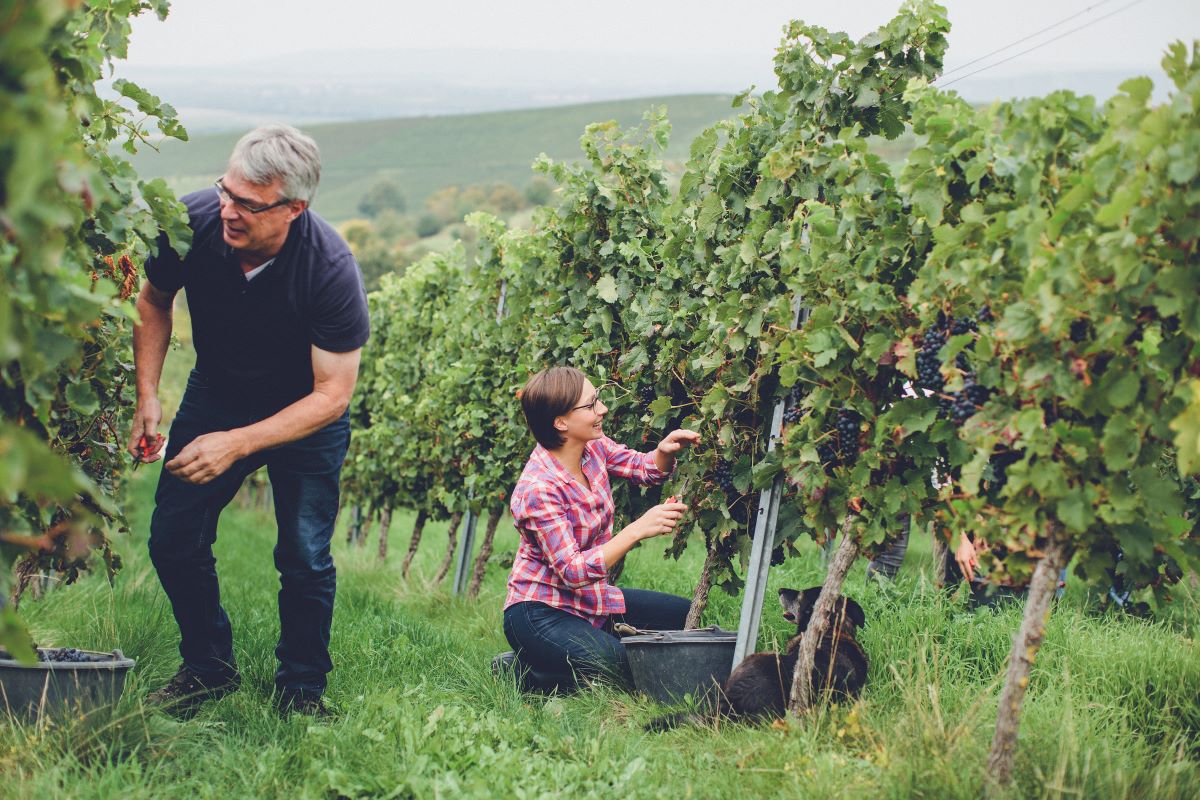 Das erreichen wir durch regulierte Erträge, eine durchdachte und schonende maschinelle Pflege der Weinberge – und durch ganz viel Handarbeit, auch während der Traubenlese.